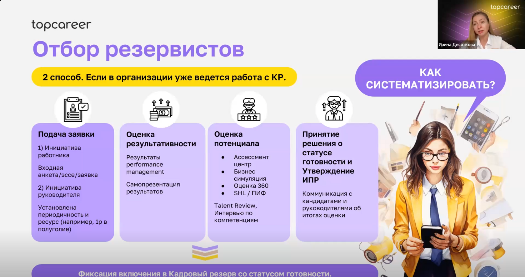 Об эксперте: - Реализовала более 30 HR-проектов, в том числе международных, по формированию профилей и оценке более 30 руководителей топ уровня, массовые оценки практических навыков и знаний для более чем 8000 участников. - Провела более 3000 интервью по компетениций на русском и английском языках. - В Careerist внедрила оценочные процедуры при приеме на различные должности коммерческого блока (в том числе Product owner), выстроила и реализовала системы базового обучения и адаптации, реализовала проекта "Кадровый резерв", формирование и внедрение управления знаниями. - В Mentorama реализовала проекты по планированию численности 2022, системы премирования, выстраиванию системы обучения и развития. - В SKillbox внедрила систему оценки руководителей для внутренних и внешних кандидатов, запустила системные процессы развития, разработала систему массового подбора, базового обучения и onboarding новичков подразделения, запустила карьерный эскалатор, который помог продвинуться талантливым продавцам с лидерским потенциалом, закрыли большую часть управленческих позиций внутренними талантами. - В ОЦКС Росатом провела аттестацию 6,5 тыс ИТР, разработала и реализовала программы по обучению проектному управлению совместно с Миланской Школой Бизнеса для ИТР Росатом, внедрила профиль руководителя проектов зарубежных строек. - Участвовала в федеральном проекте "Большая перемена" в роли ассесора. - Сертифицированный бизнес-тренер ( DOORS), консультант по вопросам карьеры, PME, SHRM. - Практикующий карьерный консультант и спикер карьерных мероприятий и курсов Техноград. - Была членом образовательного совета AACE Int и принимала участие в проектах Ассоциации. Экспертиза: - оценка 360 и проведение ИПК для компаний промышленного блока - отбор, обучение и развитие персонала различных категорий - формированиее кадровых резервов - организационное развитие - построение кадровой стратегии Клиенты (NDA): edtech, стартапы, промышленные компании, молодежные федеральные проекты